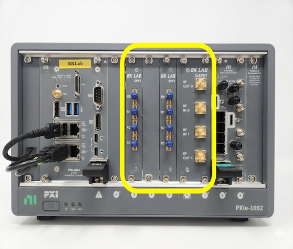BK-WTS 2.0 is a USB-controlled RF switch that mounts on an NI PXIe-1092 chassis, enabling one high-value instrument to test multiple DUTs — sequentially or simultaneously.